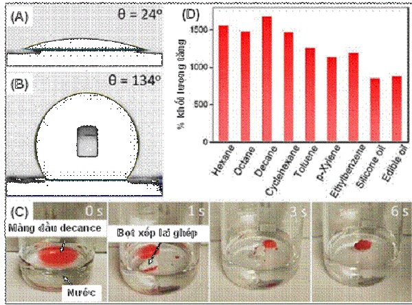 Giả thiết trên càng được củng cố hơn khi GS Xu và các cộng sự tiến hành đo góc tiếp xúc với nước của các mẫu vật liệu. Nhóm nghiên cứu nhận thấy so với sợi nano Al2O3 ban đầu, vốn có khả năng thấm nước tốt (góc tiếp xúc với nước chỉ còn 24o, hình 5A), vật liệu composite bọt xốp gần như hoàn toàn kị nước, với góc tiếp xúc lên đến 134o (hình 5B). Điều này cho thấy quá trình hòa trộn acid stearic đã tác động mạnh đến bề mặt của bọt xốp, khiến vật liệu không còn khả năng hấp phụ nước, thay vào đó là khả năng thu hút rất hiệu quả các phân tử dầu. Thật vậy, khi thử nghiệm cho một mảnh vật liệu Al2O3/acid stearic tiếp xúc với hỗn hợp chất lỏng chứa 73 mg decance (được trộn với phẩm nhuộm Oil Red O để tạo ra màu cam giúp dễ quan sát) phân tán trong nước, chỉ trong vòng 6 giây, bọt xốp Al2O3/acid stearic đã thu gom và hấp phụ toàn bộ lượng decane lên bề mặt vật liệu (hình 5C). Đặc biệt, vật liệu bọt xốp Al2O3/acid stearic còn tỏ ra hiệu quả trong việc hấp phụ nhiều phân tử hữu cơ khác, bao gồm các alkane, p-xylene, dầu silicone và kể cả dầu đậu phụng. Dung lượng hấp phụ các chất hữu cơ này có thể đạt được gấp 10 đến 15 lần khối lượng vật liệu bọt xốp được sử dụng (hình 5D).