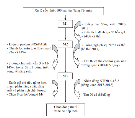 Việc chủ động trong chọn tạo giống lúa ngắn ngày, chất lượng cao, có khả năng thích ứng tốt với điều kiện nhiễm mặn dưới tác động của biến đổi khí hậu ở vùng Đồng bằng sông Cửu Long là rất cần thiết trong bối cảnh hiện nay. Giống lúa mùa Nàng Tét ven biển đã được thu thập tại huyện Thạnh Phú (Bến Tre) để làm nguồn vật liệu nghiên cứu, gây đột biến trên 100 hạt đang nẩy mầm ở nhiệt độ 500C trong thời gian 5 phút. Các cá thế được chọn lọc từ thế hệ M1-M3 theo hướng ngắn ngày (<110 ngày), chất lượng (Amylose <20%) và chịu mặn (12-14‰).