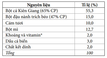 Thành phần nguyên liệu và công thức TĂCB được mô tả ở bảng 1, thức ăn nổi, kích cỡ thức ăn từ 0,4 mm - 1 mm. Thức ăn cá biển xay (CBX) là cá nục tươi, phi lê lấy phần thịt, xay nhuyễn làm thức ăn cho lươn. Thức ăn tươi sống gồm Moina, trùn chỉ.