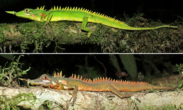 Nhông sừng mũi màu xanh lá có thể chuyển sang màu nâu cam khi căng thẳng. Ảnh: Science News.