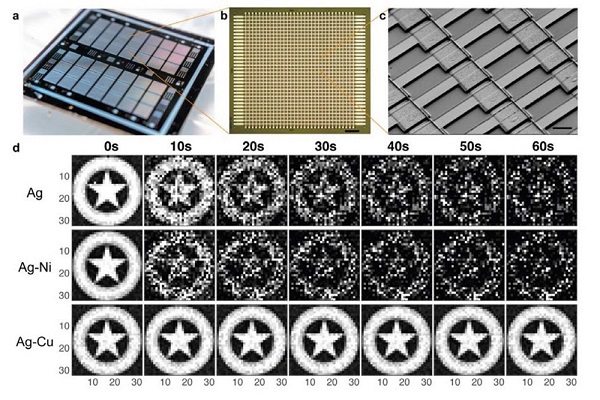 Ảnh a: Con chip nhìn từ bên ngoài. Ảnh b, c: Khi phóng to lên nhiều lần và thấy được những memristor rất nhỏ được liên kết chặt chẽ với nhau. Ảnh d: So sánh khả năng ghi nhớ hình ảnh giữa các loại vật liệu, cho thấy hợp kim bạc đồng giúp lưu dữ liệu đến 60 giây mà vẫn không bị phai mờ.