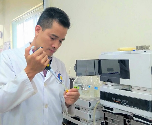 TS Hùng đang thực hiện công đoạn tách chiết hợp chất trong phòng thí nghiệm. Ảnh: NX.