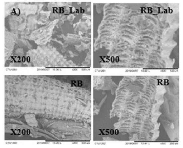 Ảnh chụp SEM biochar trấu thương mại (RB) và biochar trấu PTN (RB-Lab)