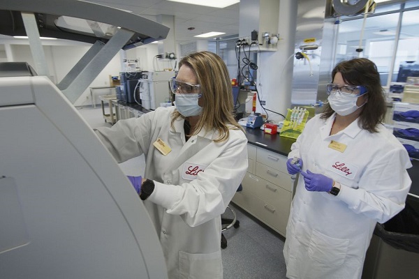 Các nhà nghiên cứu thuộc công ty Eli Lilly thử nghiệm kháng thể trị COVID-19 trong phòng thí nghiệm. Nguồn: AP