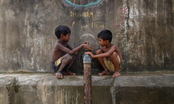Trẻ em tị nạn Rohingya chơi gần một đường ống nước. Các nước kém phát triển và những người có hoàn cảnh khó khăn phải đối mặt với nguy cơ phơi nhiễm cao hơn. Ảnh: Ed Jones/AFP/Getty Images.