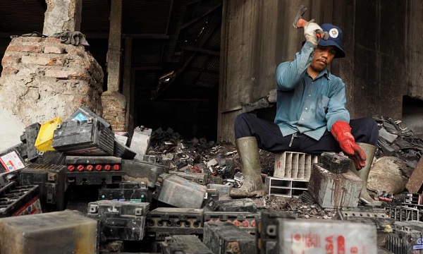 Một người đàn ông ở Tegal, Indonesia, đang dùng búa đập vỡ những cục pin cũ để lấy chì bên trong. Việc thải bỏ ắc-quy ô tô không đúng cách là nguyên nhân chính gây ra ngộ độc chì. Ảnh: Larry C Price/Pure Earth.
