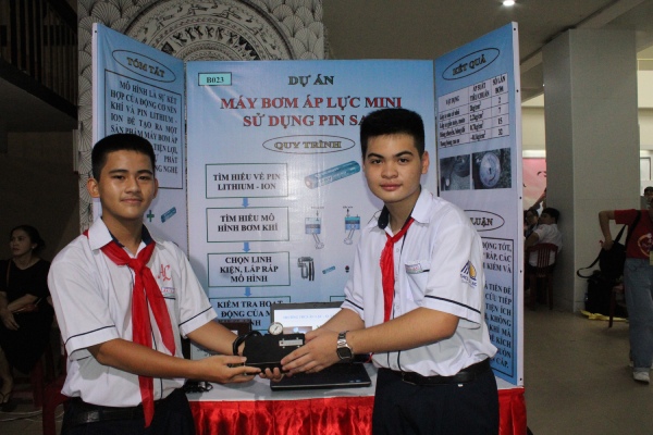Thiết bị “nhỏ nhưng có võ” này có tên là “Chiếc máy bơm áp lực mini sử dụng pin sạc” do hai học sinh Trường THCS Âu Lạc (Q.Tân Bình) là em Phan Cao Toàn (lớp 7A1) và Huỳnh Khánh Việt (lớp 7A2) sáng chế.