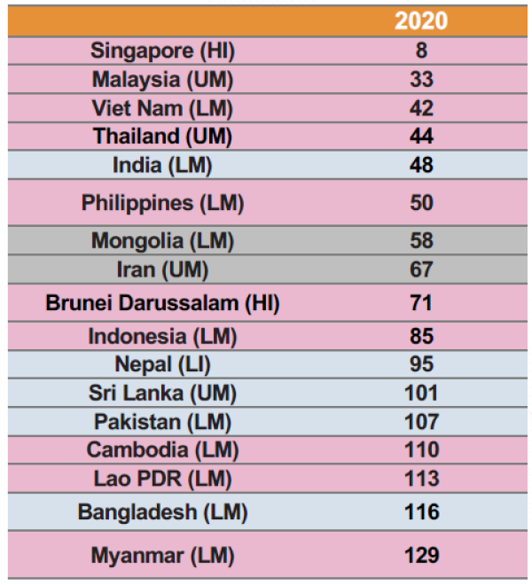 Thứ hạng trong Báo cáo GII năm 2020 của các nước khu vực Nam Á và Đông Nam Á (Nguồn: WIPO).