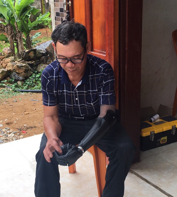 Ông Trần Đình Thêu, 51 tuổi - nạn nhân bom mìn ở tỉnh Quảng Bình, vui mừng khôn xiết vì lấy lại cánh tay đã mất của mình. Cánh tay mới là robot, có thể giúp ông rất nhiều trong sinh hoạt, cầm - nắm đồ vật và đặc biệt là thái rau cho đàn heo để kiếm kế sinh nhai.
