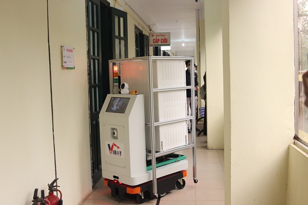 Robot VIBOT-1a của Học viện Kỹ thuật Quân sự chạy thử nghiệm giao thuốc và thức ăn tại các phòng bệnh của Bệnh viện Bắc Thăng Long tháng 4/2020. Ảnh: BN.
