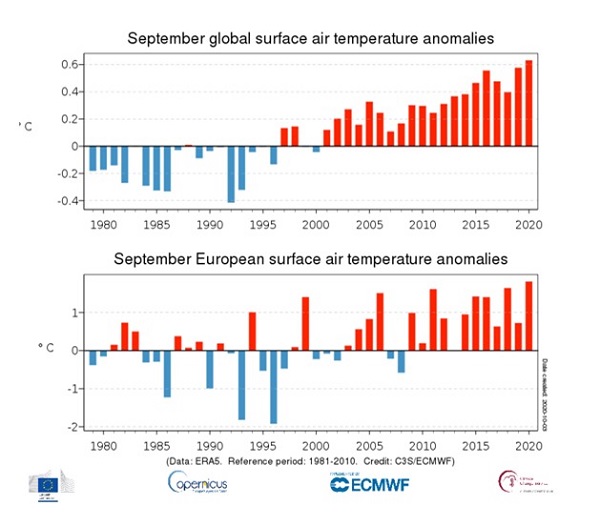 Các nhà khoa học ở Dịch vụ Biến đổi Khí hậu Copernicus (C3S) tại Trung tâm Dự báo Thời tiết Tầm trung Châu Âu (ECMWF) cho biết, nhiệt độ toàn cầu tháng 9/2020 cao hơn 0,05°C so với tháng 9 nóng kỷ lục từng ghi nhận năm 2019.