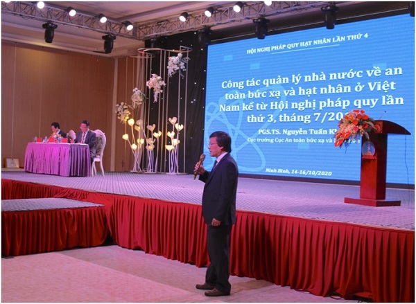 Ngay sau Lễ khai mạc, Cục trưởng Cục ATBXHN Nguyễn Tuấn Khải có bài trình bày về công tác quản lý nhà nước về ATBXHN ở Việt Nam kể từ Hội nghị Pháp quy hạt nhân toàn quốc lần thứ 3 bao gồm công tác xây dựng văn bản quy phạm pháp luật, cấp phép, thanh tra, các hoạt động đào tạo và hỗ trợ kỹ thuật phục vụ quản lý nhà nước. Báo cáo cũng chỉ ra những thách thức, khó khăn vướng mắc gặp phải và đề xuất kiến nghị để nâng cao hiệu quả quản lý nhà nước, duy trì và phát triển nguồn nhân lực trong lĩnh vực NLNT ở nước ta. Theo ông Nguyễn Tuấn Khải, để tăng cường hơn nữa hiệu quả công tác quản lý nhà nước về ATBXHN cần tiếp tục hoàn thiện hệ thống văn bản pháp lý (TC, QCKT trong y tế, an ninh hạt nhân, quản lý vật liệu NORM), sửa Luật NLNT và sớm ban hành Nghị định của Chính phủ về đăng ký tiến hành công việc bức xạ và dịch vụ ứng dụng NLNT. Cùng với đó là tăng cường công tác thẩm định cấp phép, công tác thanh tra và xử lý vi phạm, tổ chức công tác thông tin tuyên truyền, đào tạo về bảo đảm an toàn và an ninh nguồn phóng xạ.