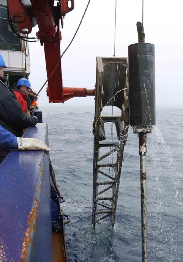 18 lõi trầm tích từ đáy biển được đưa lên tàu nghiên cứu Polastern bằng pit tông và máy dò trọng lực. Nguồn: Phys.org