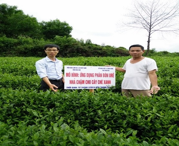 Cán bộ của Viện Hóa học hướng dẫn bà con sử dụng Phân bón nhả chậm tại vườn chè Thái Nguyên. Ảnh: Trung Đức.