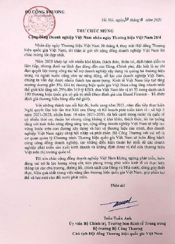 Hướng tới kỷ niệm Ngày Thương hiệu Việt Nam 20/4, nhằm tăng cường nhận biết trong đại chúng và cộng đồng doanh nghiệp về Chương trình Thương hiệu quốc gia Việt Nam, quảng bá giới thiệu các doanh nghiệp Việt Nam có sản phẩm đạt Thương hiệu quốc gia đã được Chính phủ công nhận tới cộng đồng xã hội trong và ngoài nước, Cục Xúc tiến thương mại, Bộ Công Thương tiếp tục tổ chức Tuần lễ Thương hiệu quốc gia Việt Nam 2021 từ ngày 19-25/4/2021.