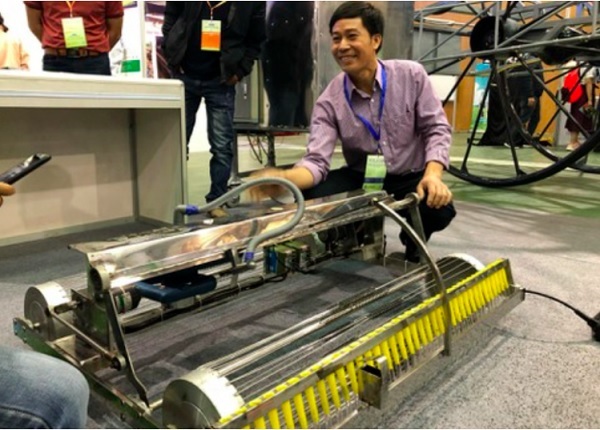Anh Phạm Văn Hát ở Tứ Kỳ, Hải Dương bên chiếc máy gieo hạt do mình sáng chế. Chiếc máy này đã xuất khẩu đi 14 nước trên thế giới. Ảnh: infonet