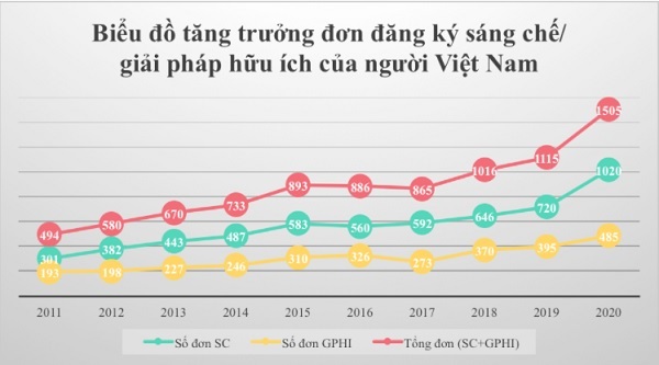 Dù vậy, một kết quả đáng ghi nhận trong năm 2020 là mặc dù trong bối cảnh đại dịch Covid-19, số lượng đơn đăng ký sáng chế và giải pháp hữu ích của các chủ thể nước ngoài giảm 2% thì số lượng đơn đăng ký sáng chế và giải pháp hữu ích của các chủ thể Việt Nam vẫn tăng 35% so với năm 2019. Trong giai đoạn 10 năm qua, lượng đơn đăng ký sáng chế/giải pháp hữu ích của người Việt Nam đã tăng trưởng rõ rệt, nếu như khoảng những năm 2011 chỉ có vài trăm đơn được nộp mỗi năm thì đến 2020, con số này đã tăng gấp ba lần (xem biểu đồ).