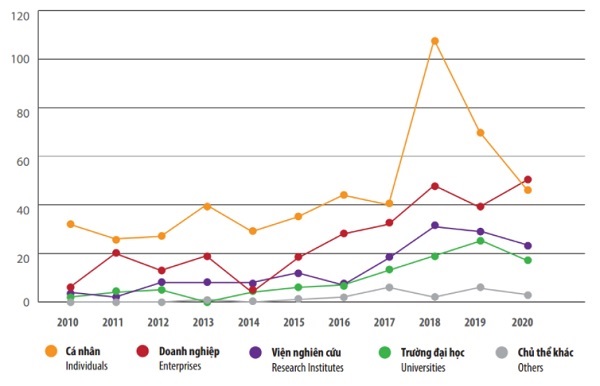 Biểu đồ 2: Số lượng bằng độc quyền sáng chế của người nộp đơn Việt Nam năm 2010-2020 theo chủ thể.