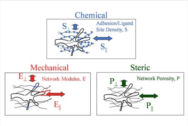 Trong nghiên cứu mới này nhằm mục đích tìm hiểu hướng dẫn tiếp xúc và cải thiện kỹ thuật mô, nhóm nghiên cứu tại Đại học California, Irvine và Đại học California, Los Angeles kiểm tra độ bền cơ học (độ cứng của sợi) theo hai hướng khác nhau trong gel của các sợi được căn chỉnh để xem liệu đó có phải là yếu tố chính trong chuyển động của tế bào thay vì độ xốp của các sợi hoặc độ kết dính của các sợi hay không.