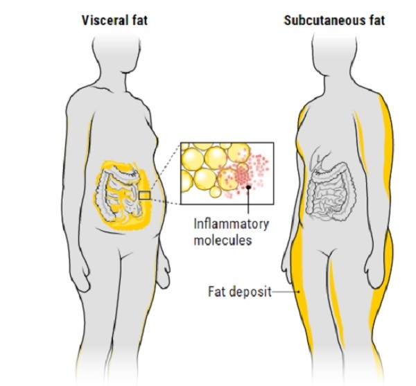 Mỡ nội tạng dư thừa (bên trái), nằm sâu trong bụng, gây viêm nhiễm và gây tích tụ nhiều chất béo hơn ở một số cơ quan bên trong, trong khi mỡ dưới da (bên phải) có nhiều tác dụng với sức khỏe.