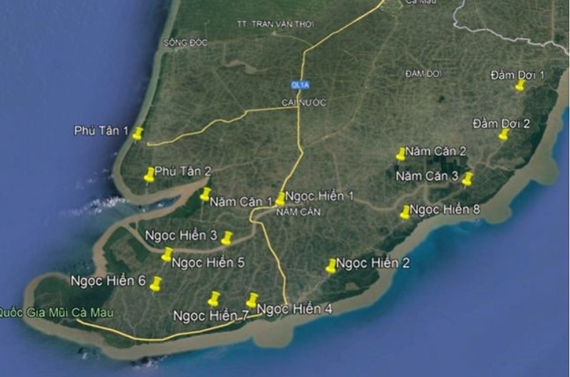 The satellite image shows the location of 15 stations at key water points in Ca Mau.