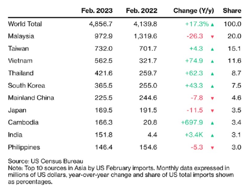 U.S. semiconductor chip imports rose 17% year-over-year to $4.86 billion in February, according to US Census data. Asian countries provided 83% of them. India recorded a 34-fold increased in semiconductor shipments to $152 million, while Cambodia posted an impressive growth of 698% - rising to 8th place among semiconductor chip suppliers to the US. This is Cambodia's most impressive growth.
