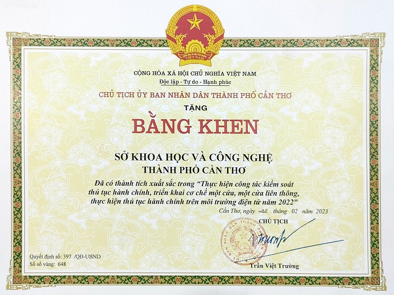 In order to timely encourage and reward collectives with outstanding achievements in performing administrative procedures control, implementing one-door and connected one-door mechanisms, implementing administrative procedures on the electronic environment in 2022” in the city; On February 22, 2023, the Chairman of Can Tho City People's Committee issued the Commendation Decision No. 397/QD-UBND for departments, agencies, and units under the City People's Committee.
