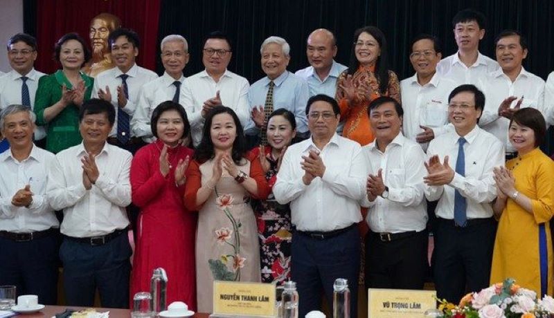 Prime Minister Pham Minh Chinh took souvenir photos with senior journalists and leaders of press agencies. Photo: Ngoc Thang/Thanh Nien Newspaper