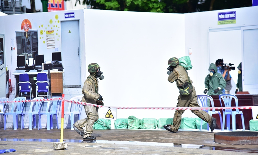 Chemical Corps soldiers of Military Region 9 handle a situation according to their mission during a radiation and nuclear incident response exercise. (Photo: People's Army Newspaper).